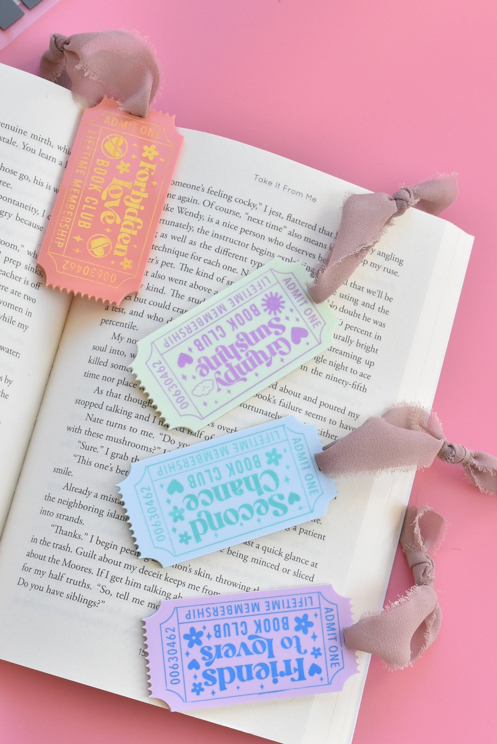These pastel ticket-style bookmarks are made for romance readers who live for Grumpy Sunshine, Second Chance, Friends to Lovers, and Forbidden Love tropes. Designed to look like vintage admission tickets, these bookmarks feature soft knotted ribbon toppers — giving them that perfect book club meets cozy aesthetic.